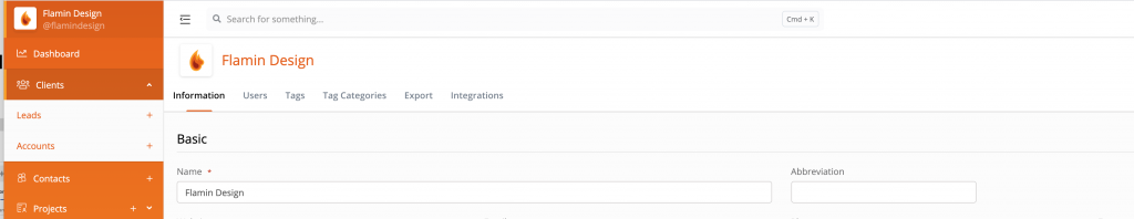 Click on the arrow to the right of “Clients”, in the left hand menu, to show the options “Lead” and “Accounts”. Click the “+” next to “Leads” if it is a new Lead customer Lead or the “+” next to “Accounts” if it is a standard client account.
